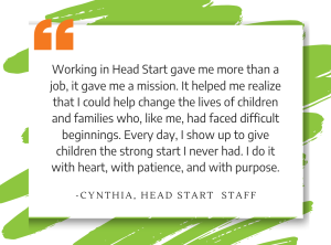 Working in Head Start gave me more than a job, it gave me a mission. It helped me realize that I could help change the lives of children and families who, like me, had faced difficult beginnings. Every day, I show up to give children the strong start I never had. I do it with heart, with patience, and with purpose.