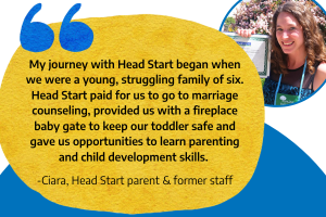 Last month, we put out a call for story submissions and received a total of 24 stories, each a testament to the remarkable impact of Head Start. We are deeply thankful for the willingness of all contributors to share their deeply personal, heartwarming, and inspiring anecdotes and experiences—be it attending, working at, or witnessing their children’s growth through Head Start. Discover Ciara’s inspiring Head Start journey here as she shares her experience enrolling her children in the program, receiving vital family assistance, and embarking on a career in early childhood education.