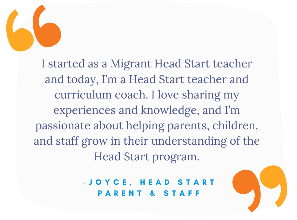 I started as a Migrant Head Start teacher, and later became a Head Start teacher. Today, I’m a Head Start teacher and curriculum coach. While there isn’t a lot of money in this field, I’m here to make a difference in the lives of families, children, and now, teachers. I love sharing my experiences and knowledge, and I’m passionate about helping parents, children, and staff grow in their understanding of the Head Start program.