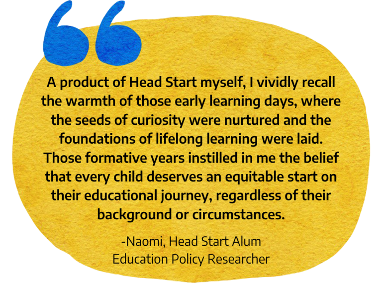 Today, as an education policy researcher, I am driven by the belief that every child’s potential is boundless, waiting to be unlocked by quality early childhood education. Head Start’s influence has guided me to advocate fervently for accessible learning opportunities that empower young minds, nurturing a generation of curious thinkers and resilient learners.