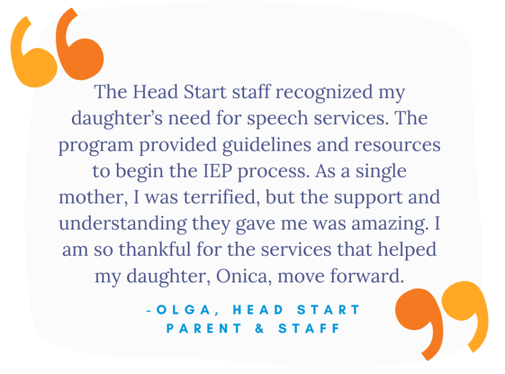The Head Start staff recognized my daughter’s need for speech services. The program provided guidelines and resources to begin the IEP process. As a single mother, I was terrified, but the support and understanding they gave me was amazing. I am so thankful for the services that helped my daughter, Onica, move forward.
